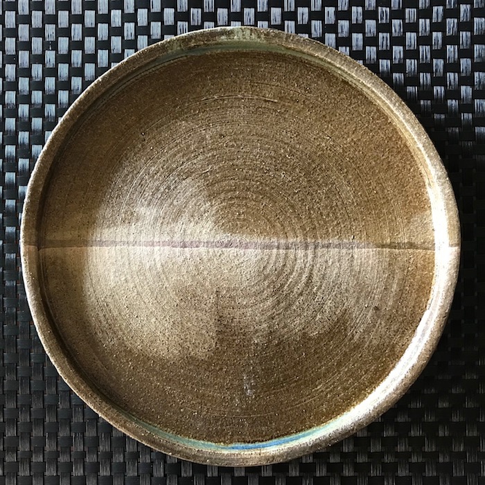 古信楽土。2方向から黒マット釉薬を掛けて中央に線を引く。直径22cm。