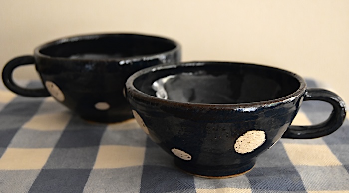 古信楽の土に撥水で水玉を描き海鼠釉を掛ける。軽くて手に馴染むカップができました。