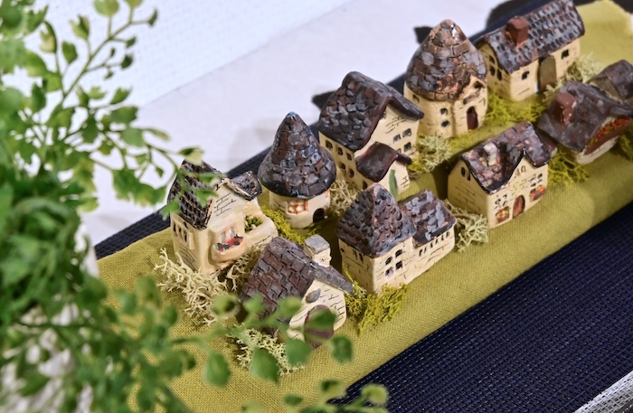 今回は黒マットとカオリンマットの白い器。そしてコッツウォルツ風(?)のミニチュアハウスを並べました。